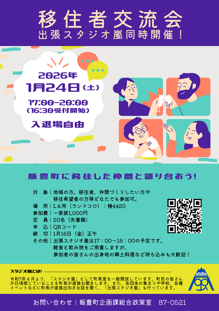 移住者同士・移住者と地域がつながることを目的に移住者交流会を開催します。地域の方、移住者、仲間づくりをしたい方や移住希望者の方等どなたでも参加可!出張スタジオ嵐も同時開催します。ぜひご参加ください。